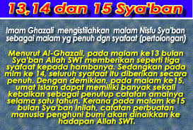 Bulan Sya’aban, keagungan malamnya dengan Nisfu Syaaban seperti keagungan Ramadhan dengan Lailatul Qadarnya. Maka pada malam Nisfu Sya’aban telah datang Jibril kepada Rasulullah s.a.w lalu katanya: Angkat kepalamu ke langit, itulah malam yang Allah beri padanya tiga ratus rahmat dan diampunkan Allah sekelian orang yang menyengutukan (syirik) denganNya dengan sesuatu, kecuali: tukang nujum, kekal dalam zina, kekal minum arak, derhaka terhadap ibubapa.